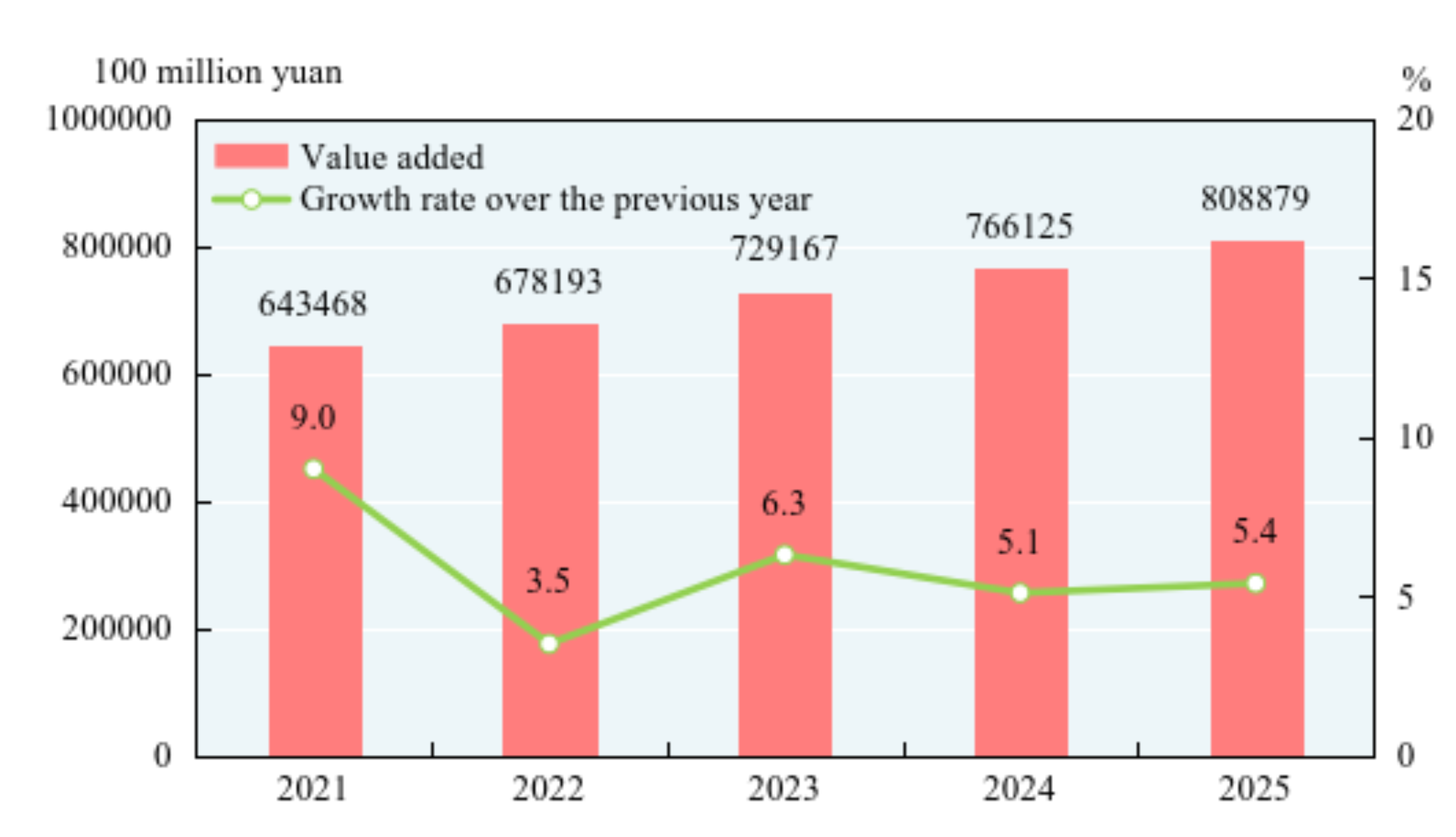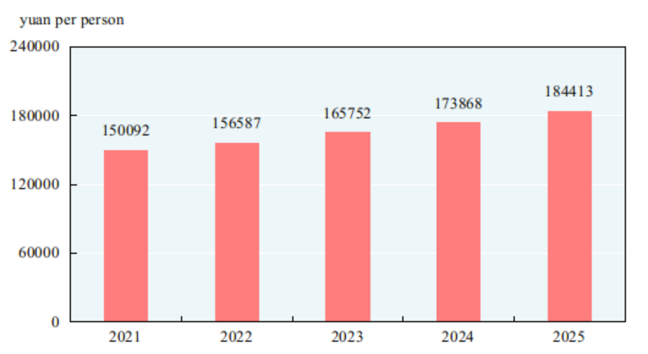 According to preliminary estimates, the gross domestic product (GDP)[2] in 2025 was 140,187.9 billion yuan, up by 5.0 percent over the previous year. Of this total, the value added of the primary industry was 9,334.7 billion yuan, up by 3.9 percent over the previous year, that of the secondary industry was 49,965.3 billion yuan, up by 4.5 percent, and that of the tertiary industry was 80,887.9 billion yuan, up by 5.4 percent. The value added of the primary industry accounted for 6.7 percent of the GDP; that of the secondary industry accounted for 35.6 percent; and that of the tertiary industry accounted for 57.7 percent. The contribution of final consumption expenditure to GDP growth rate was up by 2.6 percentage points, that of gross capital formation to GDP growth rate up by 0.8 percentage points and that of net exports of goods and services to GDP growth rate up by 1.6 percentage points. By quarter, the GDP went up by 5.4 percent year on year for the first quarter, up by 5.2 percent for the second quarter, 4.8 percent for the third quarter and 4.5 percent for the fourth quarter. The per capita GDP in 2025 was 99,665 yuan, up by 5.1 percent over the previous year. The gross national income[3]in 2025 was 140,032.7 billion yuan, up by 5.6 percent over the previous year. The overall labor productivity[4] was 184,413 yuan per person, up by 6.1 percent over the previous year.