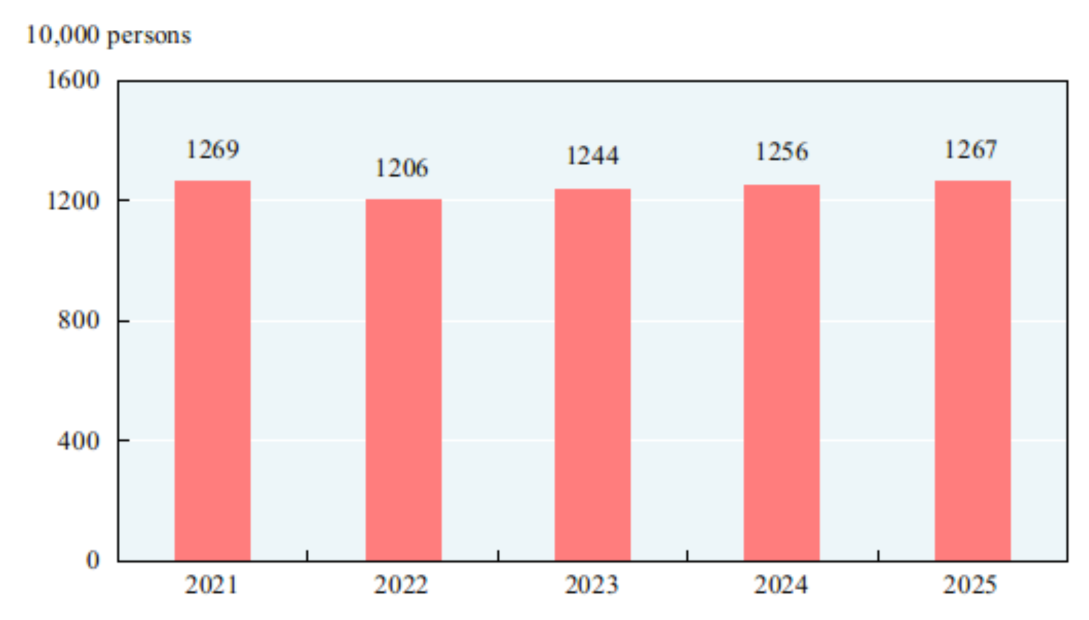 [6] By the end of 2025, the population aged 0 to 14 (under the age of 15) was 212.76 million and that aged 15 to 59 (under the age of 60) was 868.75 million.