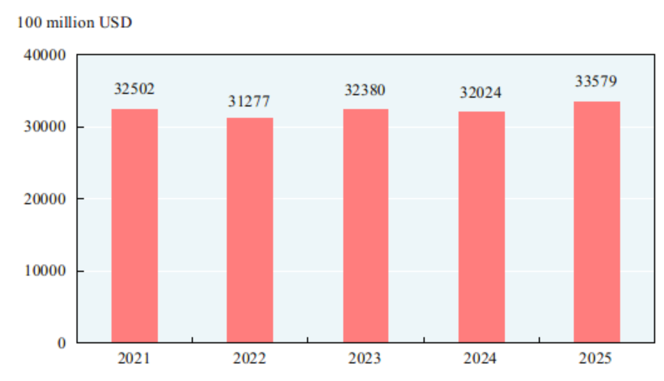 At the end of 2025, China’s foreign exchange reserves reached 3,357.9 billion US dollars, an increase of 155.5 billion US dollars compared with that at the end of 2024. The average exchange rate of the year was 7.1429 RMB to 1 USD dollar, depreciated by 0.3 percent over that of 2024.