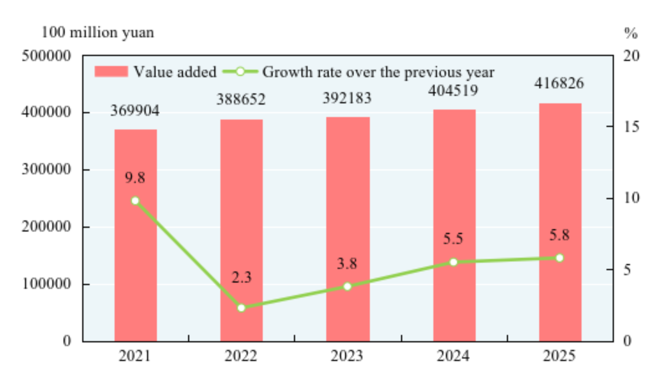 [15] The enterprises above the designated size in select service sectors refer to legal entities of transport, storage and post, information transmission, software and information technology services, management of water conservancy, environment and public facilities, and health with annual business revenue of 20 million yuan and above; legal entities of real estate (excluding real estate development and operation), leasing and business services, scientific research and technical services, and education with annual business revenue of 10 million yuan and above; and legal entities of household services, repair and other services, culture, sports and entertainment, and social services with annual business revenue of 5 million yuan and above. Legal entities of finance, wholesale and retail trades, hotels and catering services, and real estate development and operation are not included. The growth rates of financial indicators of the enterprises above the designated size in select service sectors in 2025 were calculated on a comparable basis.