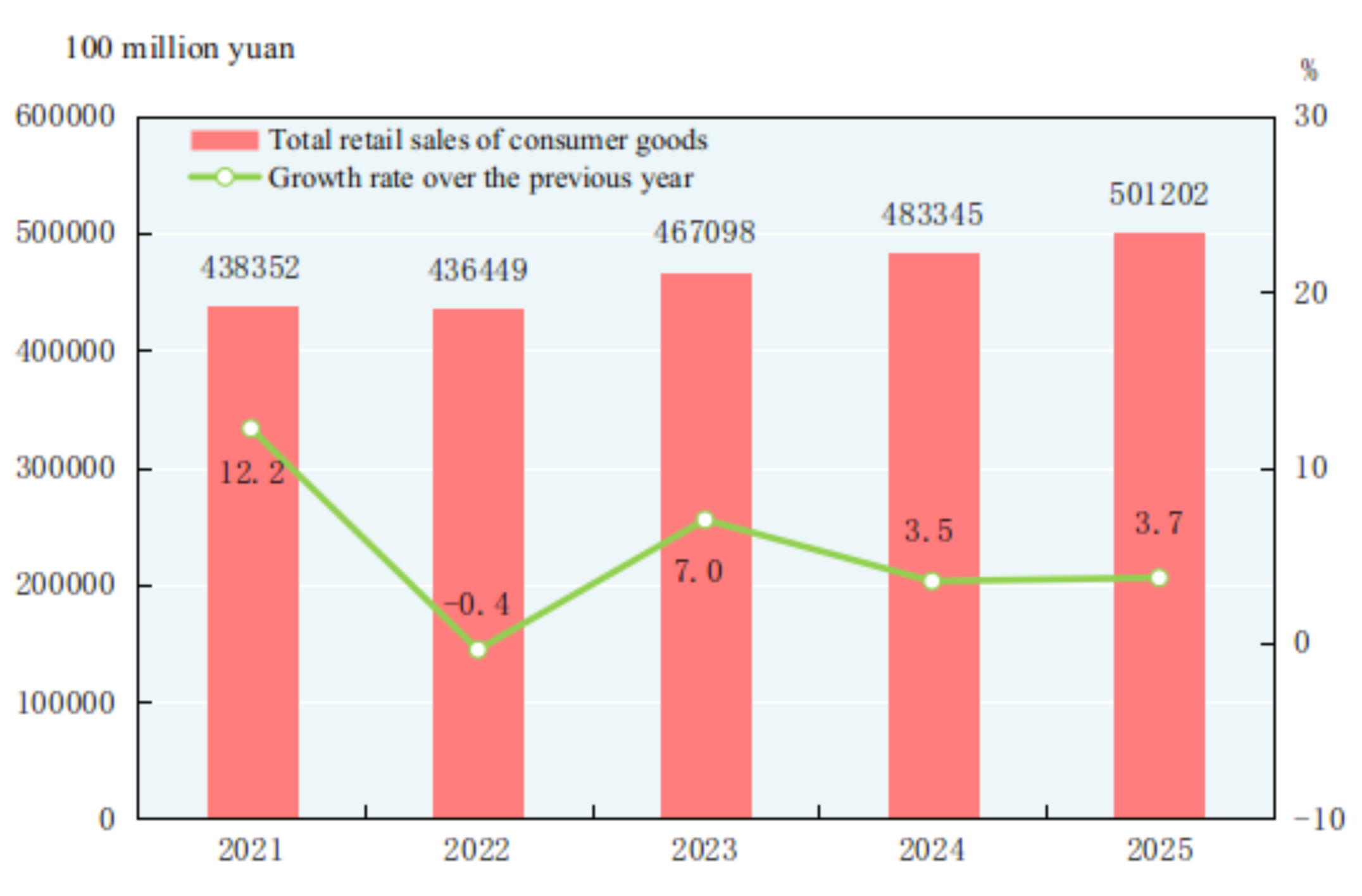 [19] Online retail sales refer to the retail sales of goods and services realized through internet trading platforms (online platforms mainly in trading physical goods, including self-built websites and third-party platforms). The growth rate of 2025 was calculated on a comparable basis.