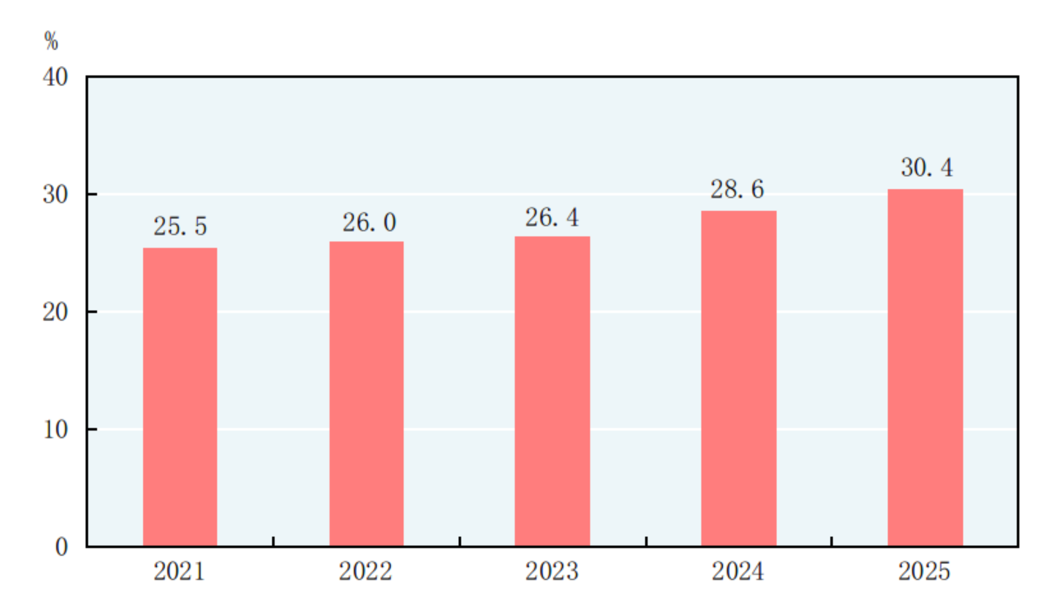 Green and low-carbon transformation achieved remarkable results. According to preliminary estimates, the national carbon dioxide emissions per 10,000 yuan worth of GDP[22] in 2025 dropped by 5.0 percent over that of the previous year. The electricity generated by clean energy such as hydropower, nuclear power, wind power and solar power was 4,248.1 billion kilowatts-hours, up by 14.4 percent over the previous year. The output of new energy vehicles reached 16.524 million, up by 25.1 percent over the previous year; the total number of new energy vehicles reached 43.97 million by the end of 2025, an increase of 12.57 million over that at the end of the previous year. Of the monitored 339 cities at prefecture level and above, 72.6 percent reached the air quality standard. Of the 3,641 sections under the national monitoring program for surface water, 91.4 percent were of fairly clean water quality (Grade I to III), 6.9 percent were Grade IV, 1.1 percent were Grade V and 0.6 percent were worse than Grade V national standard.