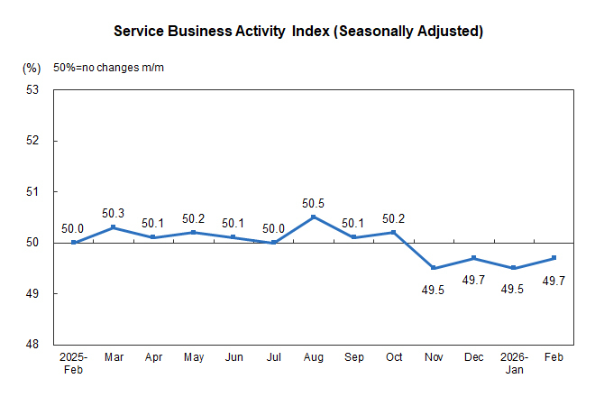 In February, the non-manufacturing business activity index was 49.5%, an increase of 0.1 percentage points from the previous month, indicating an improvement in the climate of non-manufacturing industries.