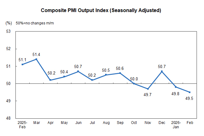 In February, the composite PMI output index was 49.5%, a decrease of 0.3 percentage points from the previous month, indicating a moderation in the overall production and business activities of Chinese enterprises compared with the previous month.