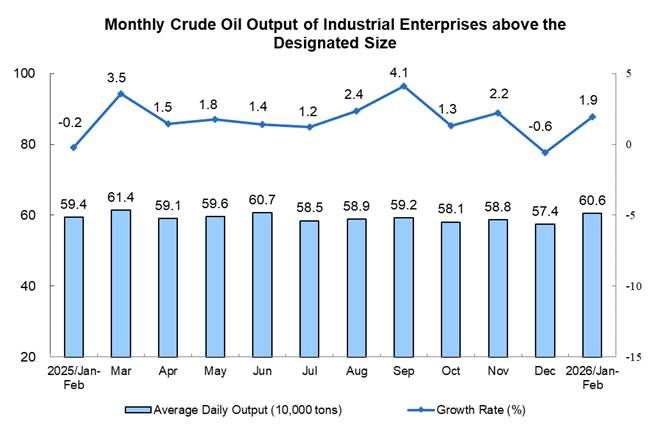 The crude oil production turned from decline to growth. From January to February, the crude oil production by industrial enterprises above the designated size was 35.73 million tons, a year-on-year increase of 1.9%, compared with a decrease of 0.6% in December 2025. The average daily output was 606 thousand tons.