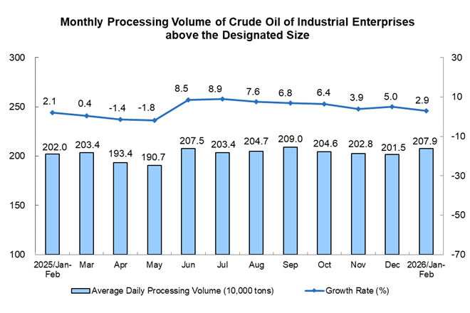 The processing volume of crude oil maintained growth. From January to February, the processing volume of crude oil by industrial enterprises above the designated size was 122.63 million tons, a year-on-year increase of 2.9%; the average daily processing volume was 2.079 million tons.