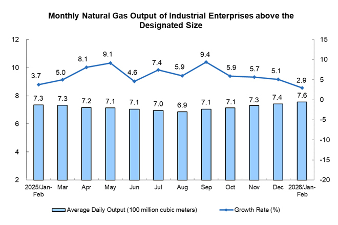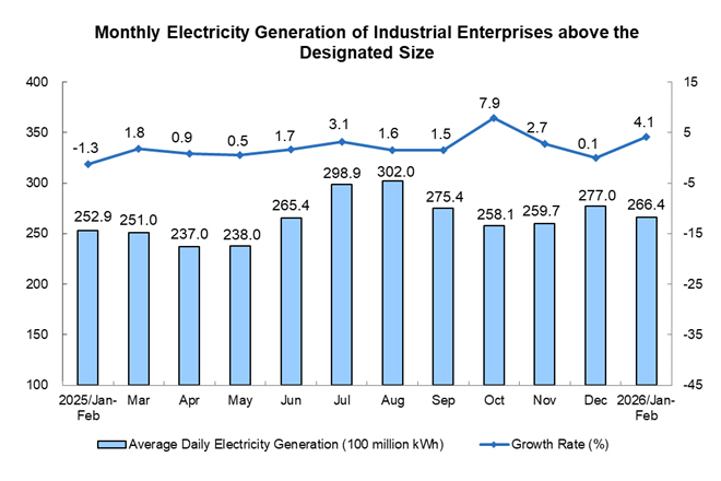 Growth of the electricity generation by industrial enterprises above the designated size accelerated. From January to February, electricity generation by industrial enterprises above the designated size was 1,571.8 billion kWh, a year-on-year increase of 4.1%, with the growth rate 4.0 percentage points higher than that in December 2025; the average daily electricity generation was 26.64 billion kWh.