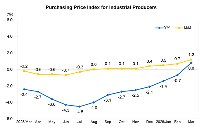 In March 2026, China’s producer price index for industrial products (PPI) turned from a 0.9% year-on-year decline in the previous month to a 0.5% increase; it increased by 1.0% month on month, with the increase 0.6 percentage points higher than the previous month. The purchasing price index for industrial producers turned from a 0.7% year-on-year decline in the previous month to a 0.8% increase; it increased by 1.2% month on month, with the increase 0.5 percentage points higher than the previous month. In the first quarter, the producer price index for industrial products decreased by 0.6% year on year, and the purchasing price index for industrial producers decreased by 0.5% year on year.