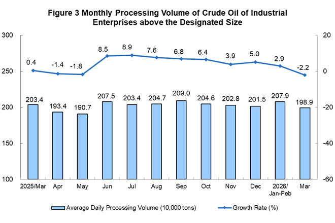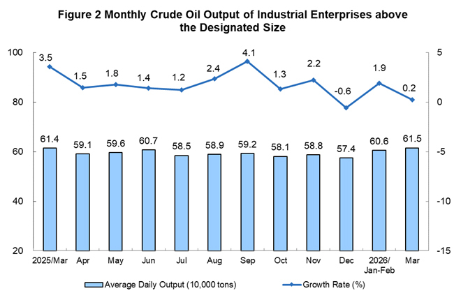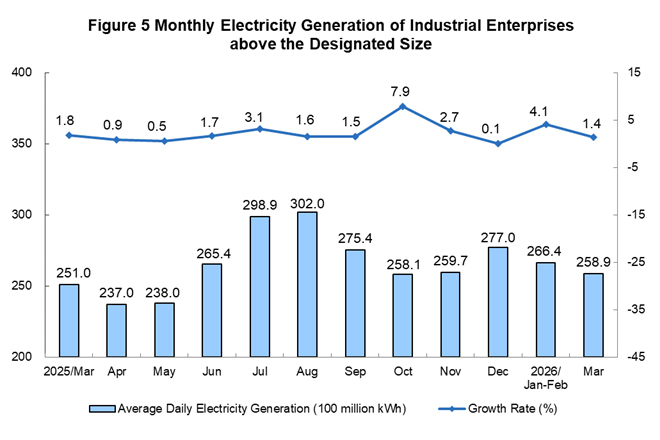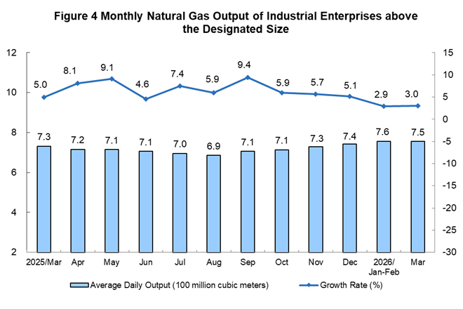 In March 2026, the raw coal production by industrial enterprises above the designated size was stable, the crude oil production maintained growth, the production of natural gas grew faster, and the growth of electricity generation was steady.