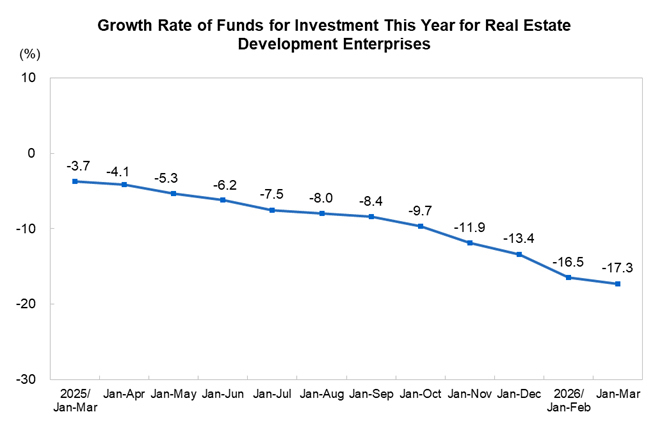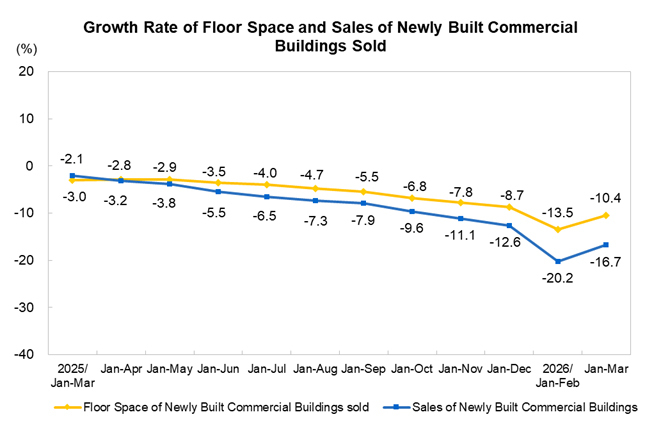 From January to March 2026, the investment in real estate development was 1,772.0 billion yuan, a year-on-year decrease of 11.2% (calculated on a comparable basis, see Annotation 5 for details), and the declineexpanded by 0.1 percentage points compared with that from January to February; of which the investment in residential buildings was 1,353.1 billion yuan, down 11.0%, and the decline expanded by 0.3 percentage points.