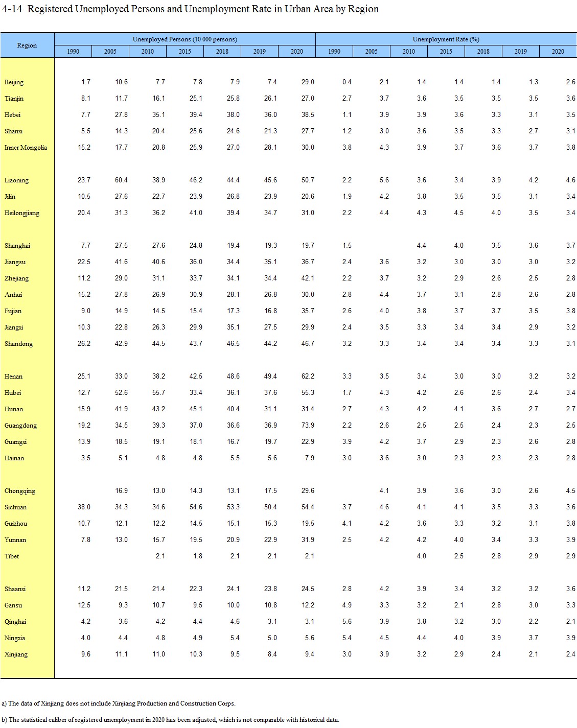 4-14 Registered Unemployed Persons and Unemployment Rate in Urban Area by Region