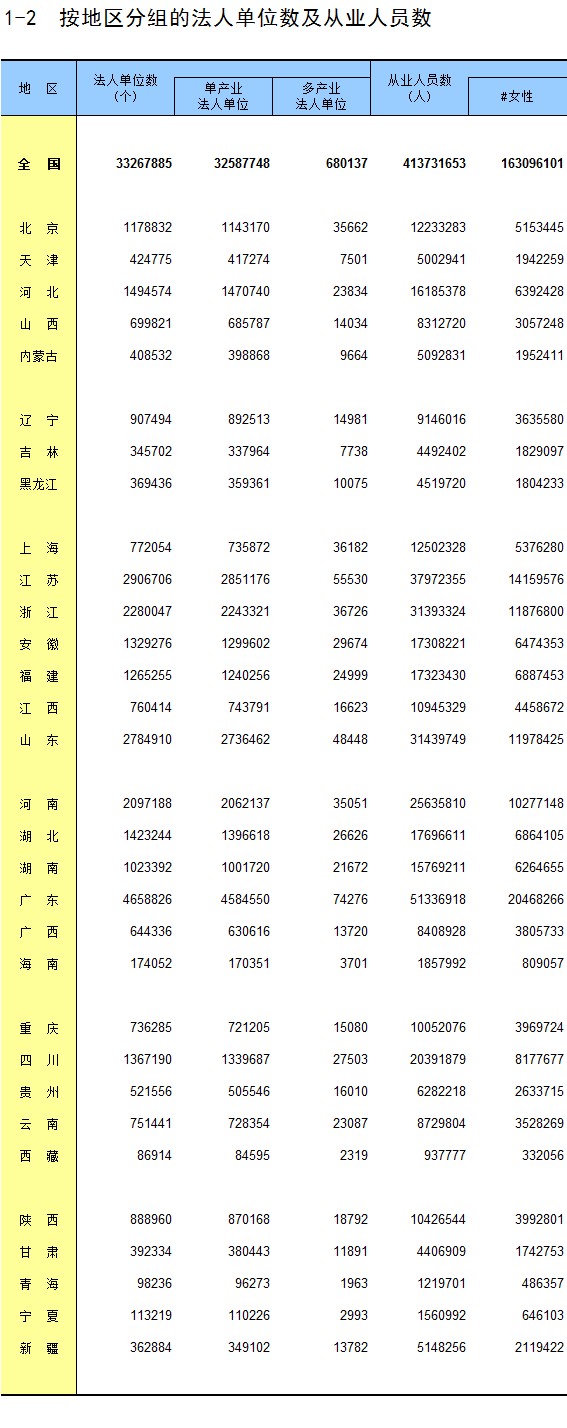 1-2 按地区分组的法人单位数及从业人员数