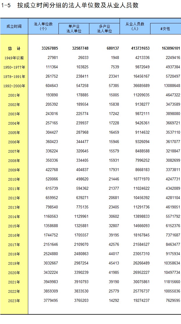 1-5 按成立时间分组的法人单位数及从业人员数
