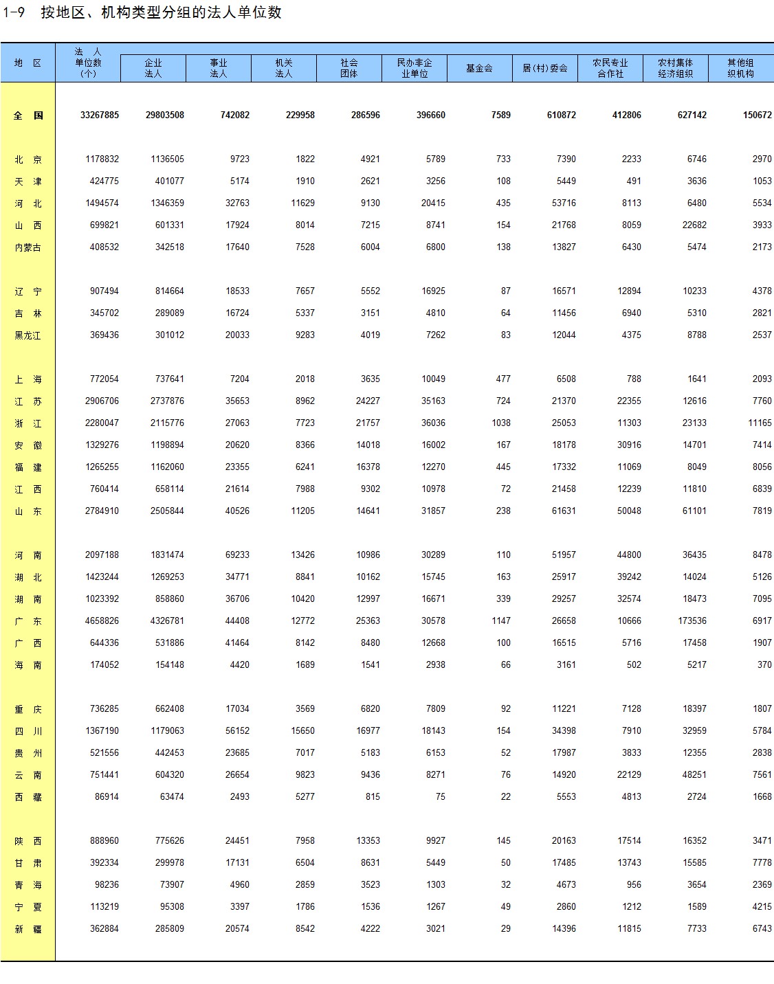 1-9 按地区、机构类型分组的法人单位数
