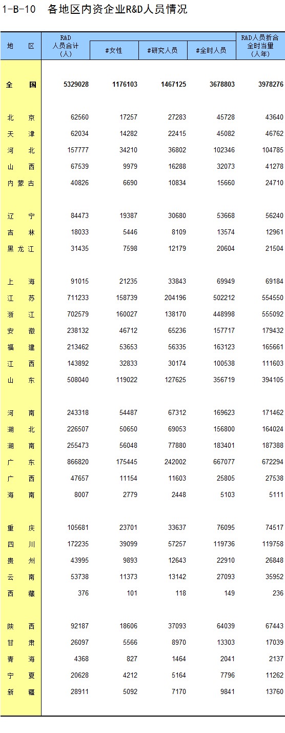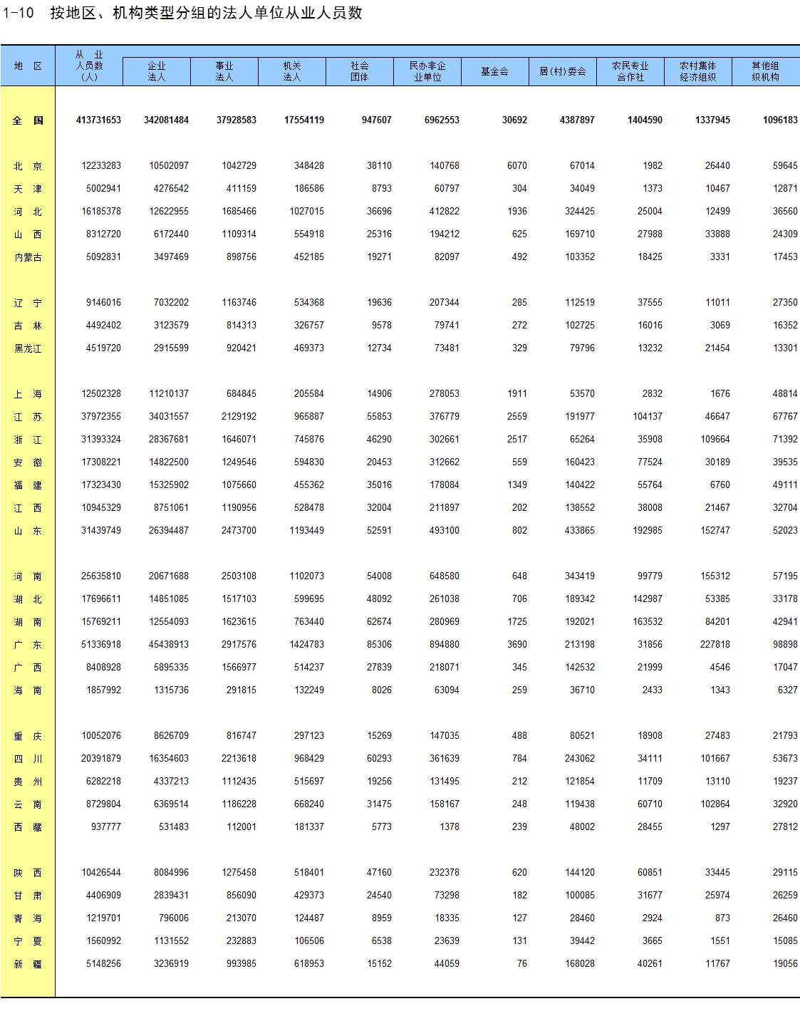 1-10 按地区、机构类型分组的法人单位从业人员数