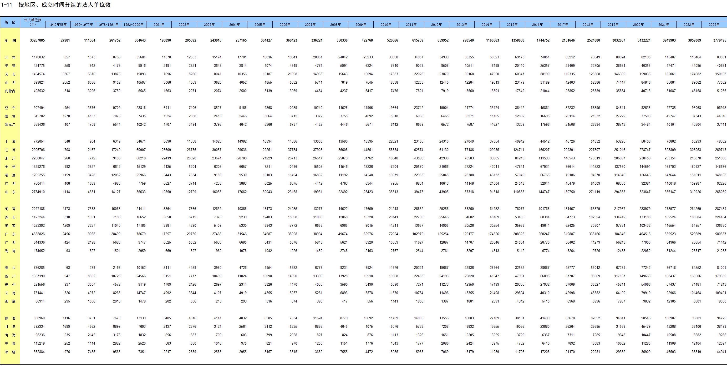 1-11 按地区、成立时间分组的法人单位数