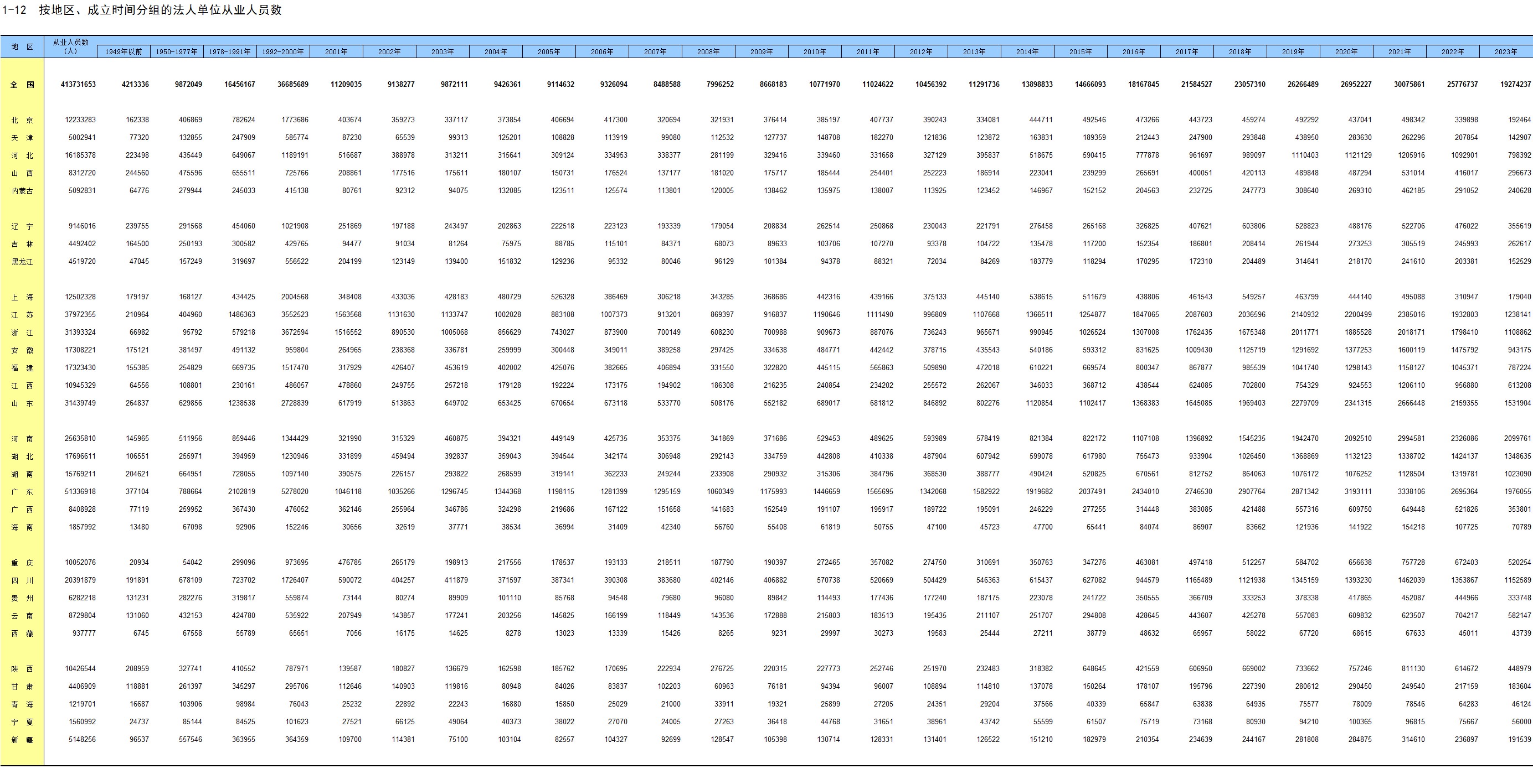 1-12 按地区、成立时间分组的法人单位从业人员数