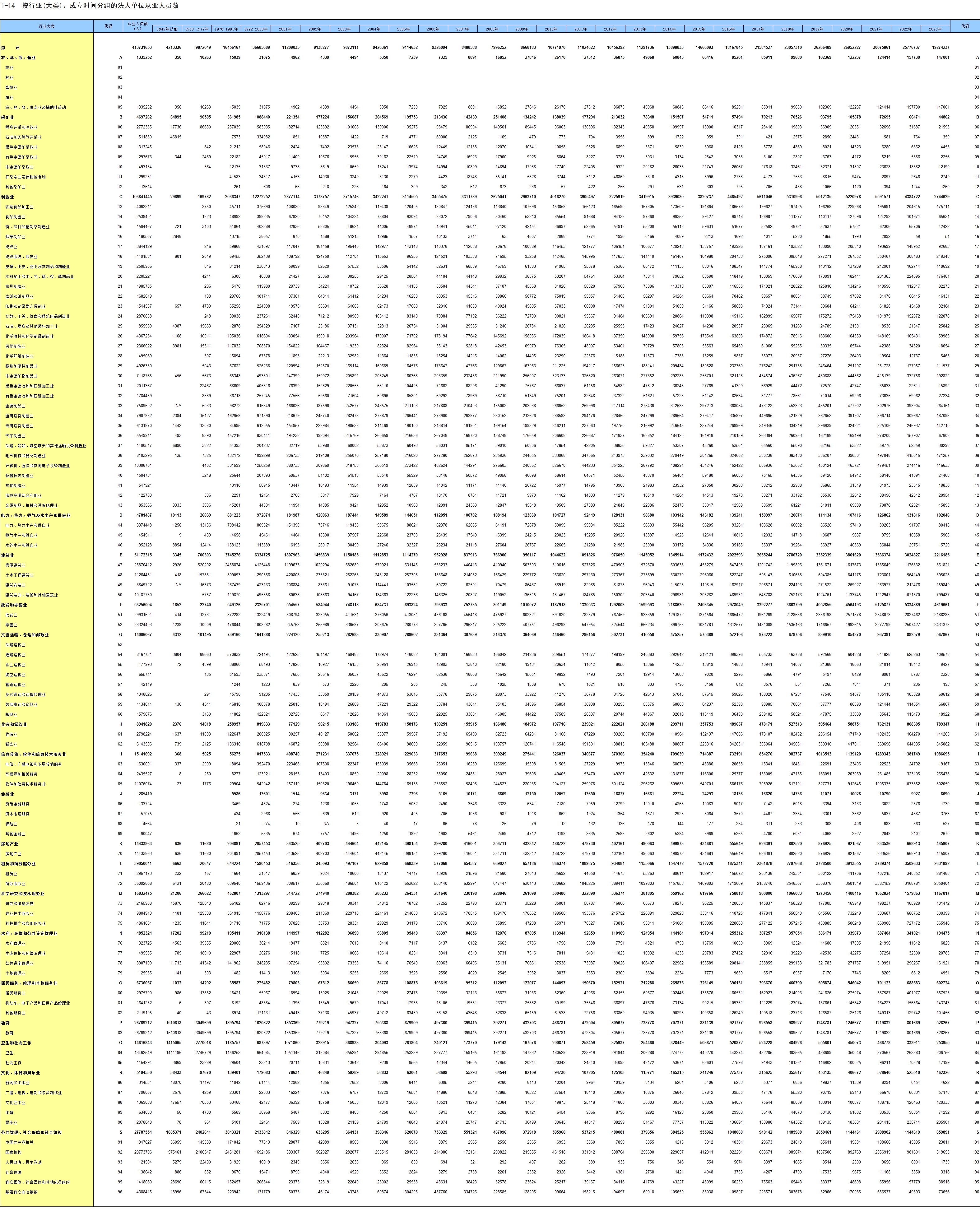 1-14 按行业(大类)、成立时间分组的法人单位从业人员数