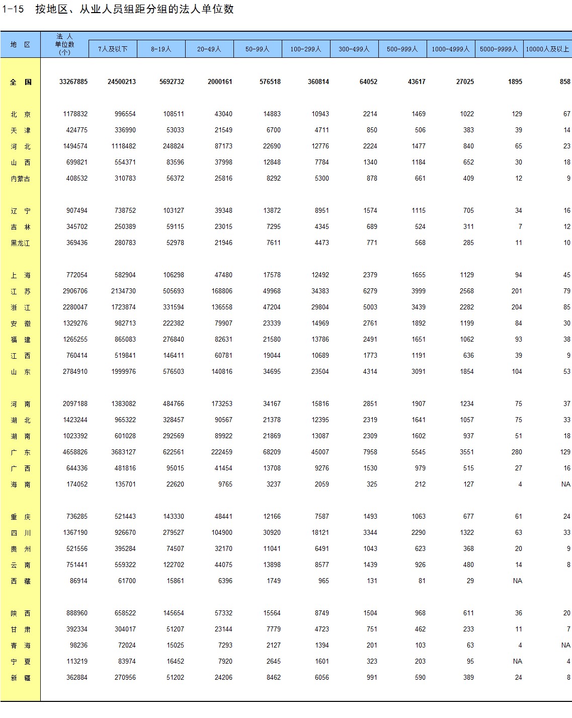 1-15 按地区、从业人员组距分组的法人单位数