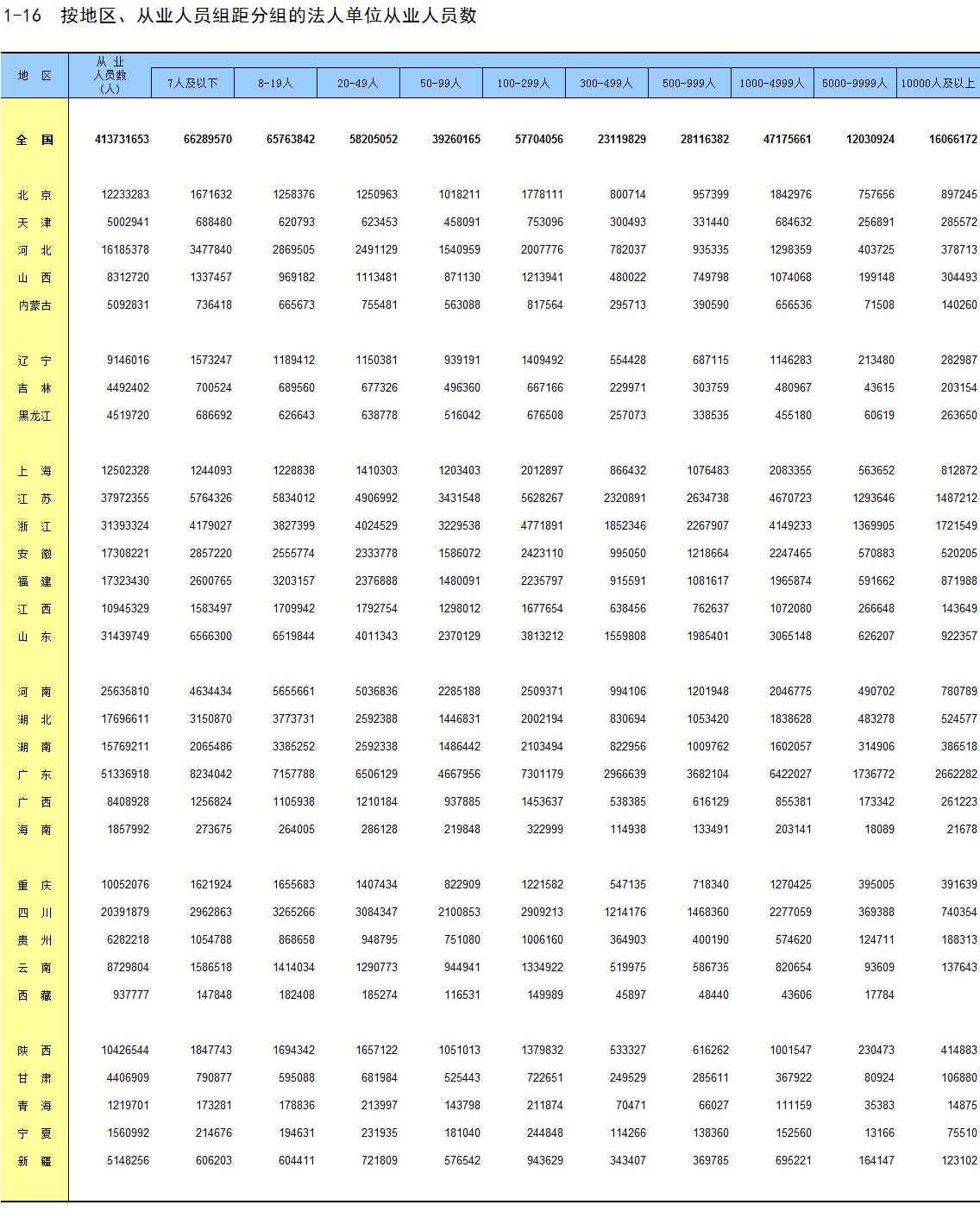 1-16 按地区、从业人员组距分组的法人单位从业人员数