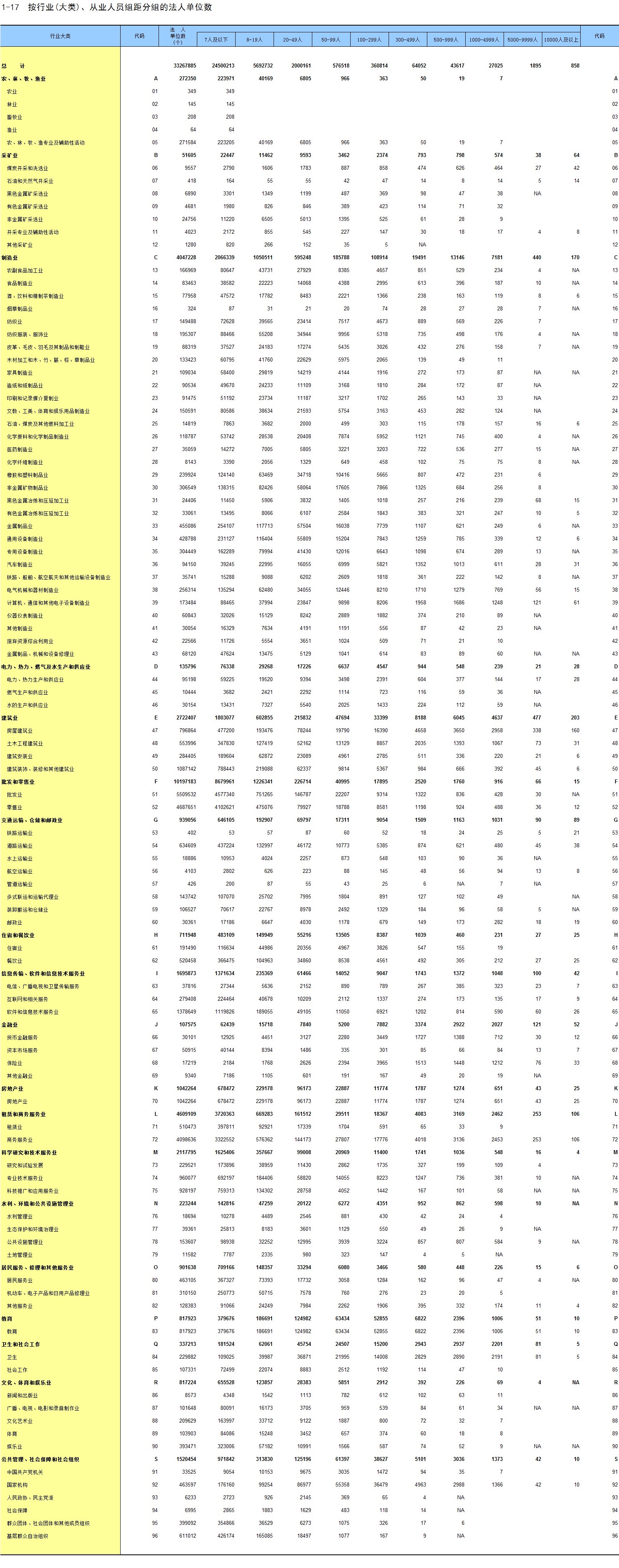 1-17 按行业(大类)、从业人员组距分组的法人单位数