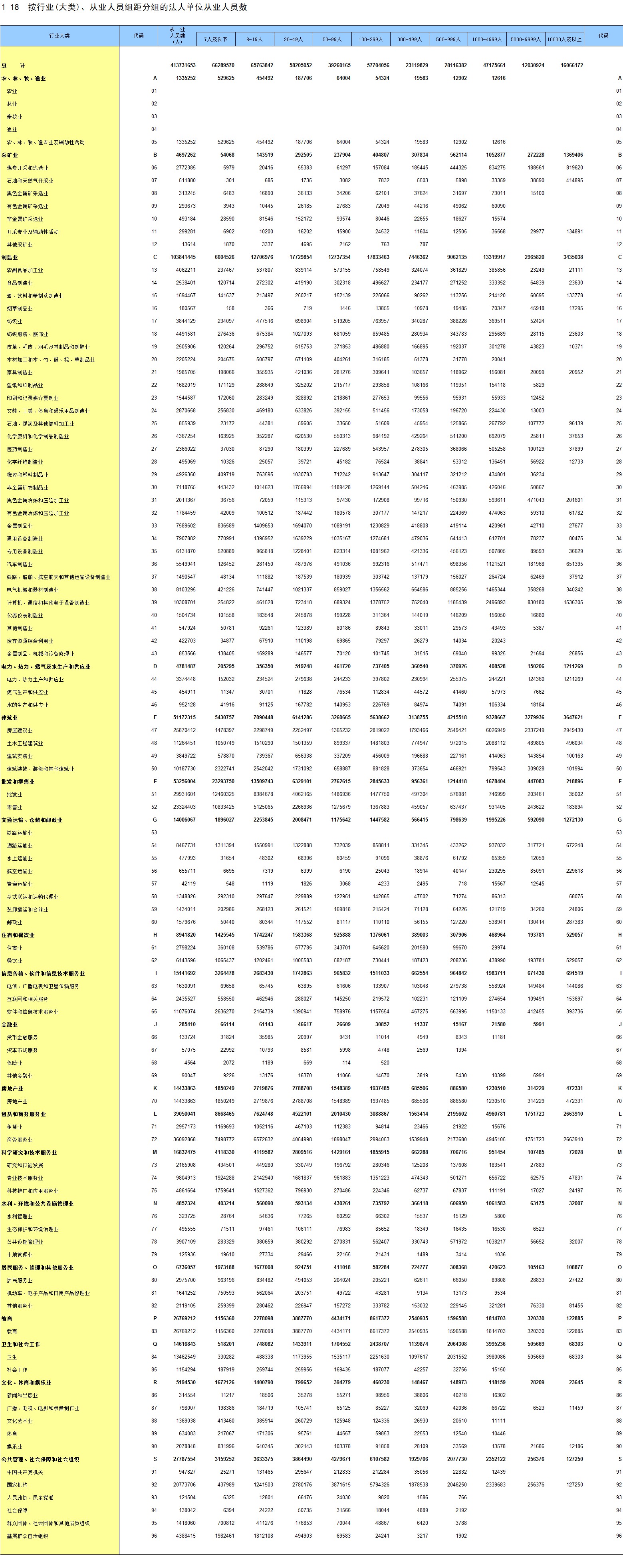1-18 按行业(大类)、从业人员组距分组的法人单位从业人员数
