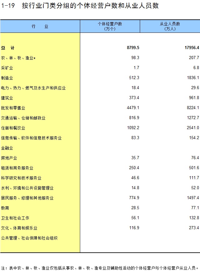 1-19 按行业门类分组的个体经营户数和从业人员数