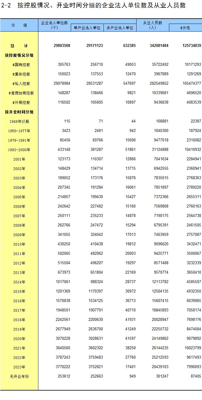 2-2 按控股情况、开业时间分组的企业法人单位数及从业人员数