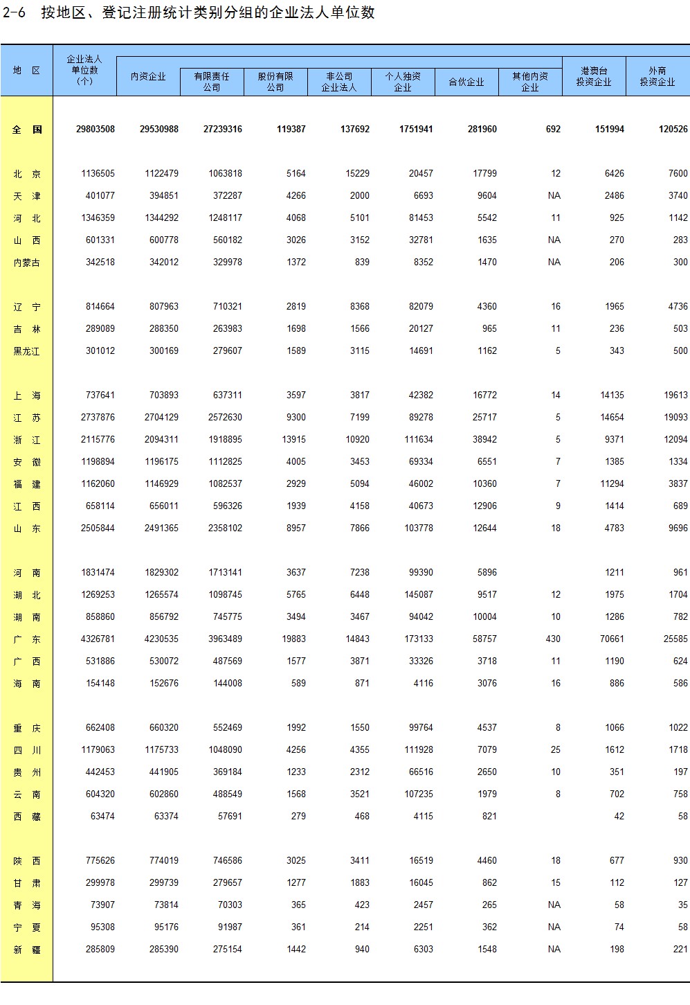 2-6 按地区、登记注册统计类别分组的企业法人单位数