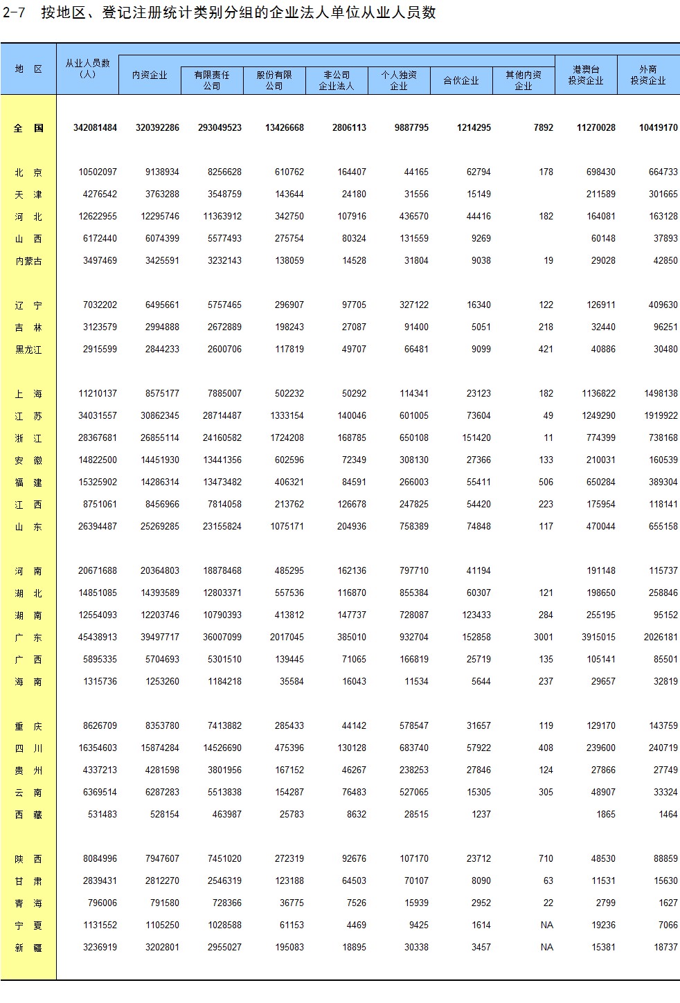 2-7 按地区、登记注册统计类别分组的企业法人单位从业人员数