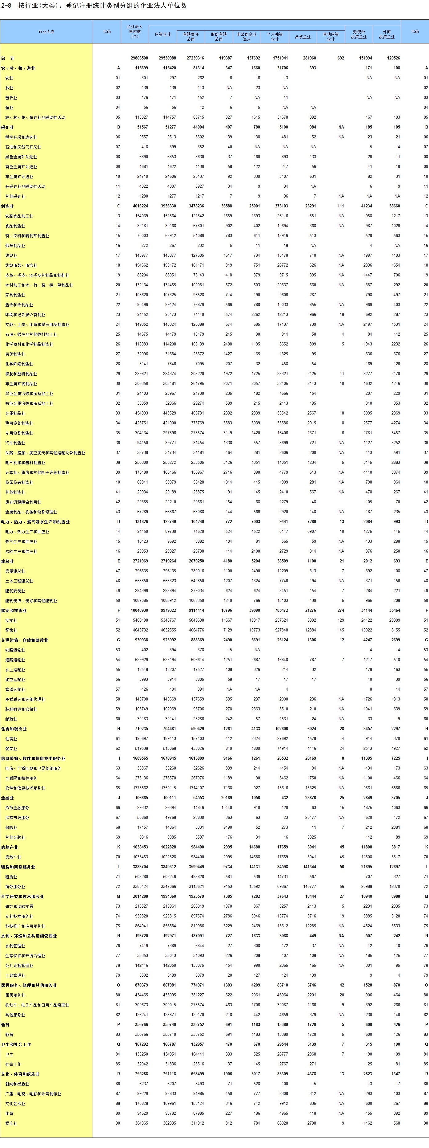 2-8 按行业(大类)、登记注册统计类别分组的企业法人单位数