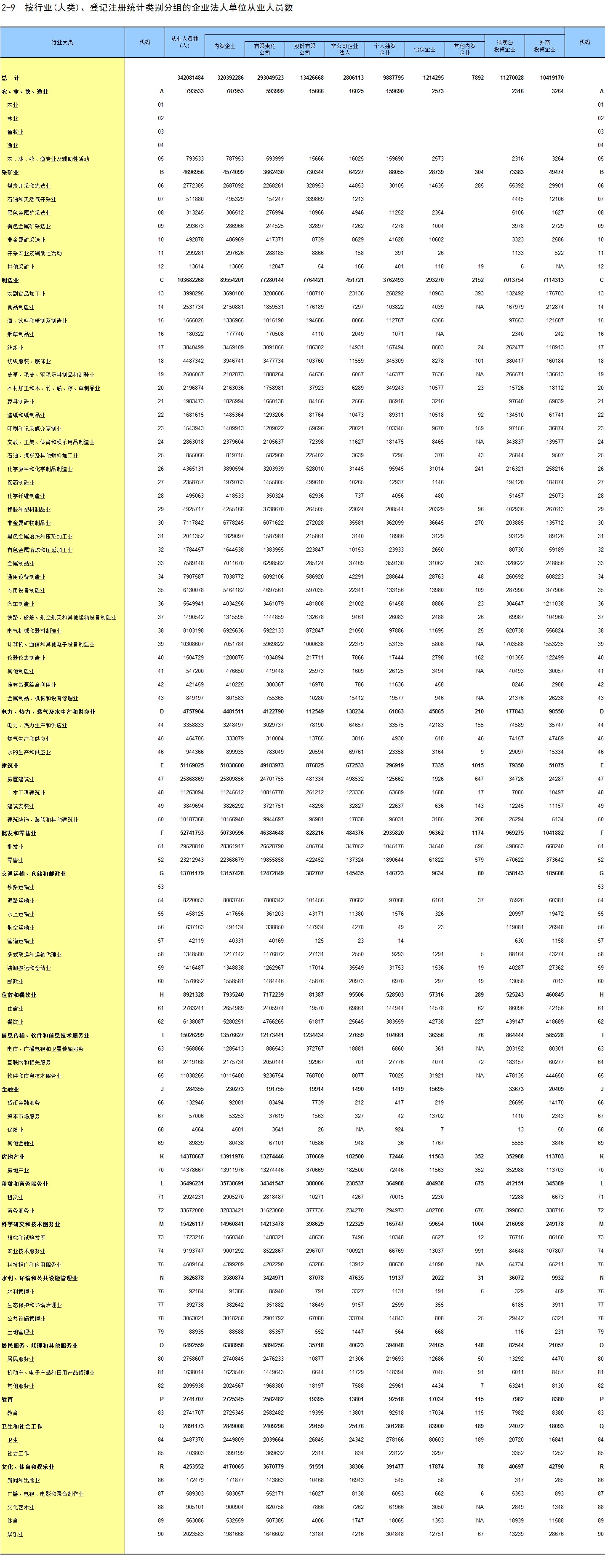 2-9 按行业(大类)、登记注册统计类别分组的企业法人单位从业人员数
