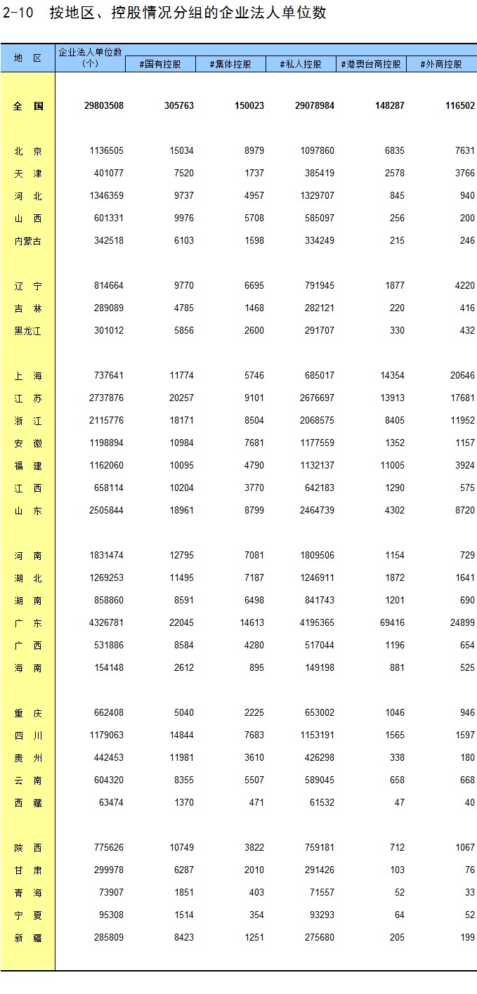 2-10 按地区、控股情况分组的企业法人单位数