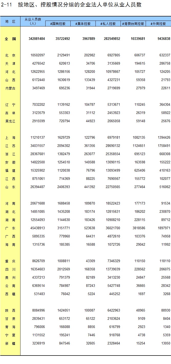 2-11 按地区、控股情况分组的企业法人单位从业人员数