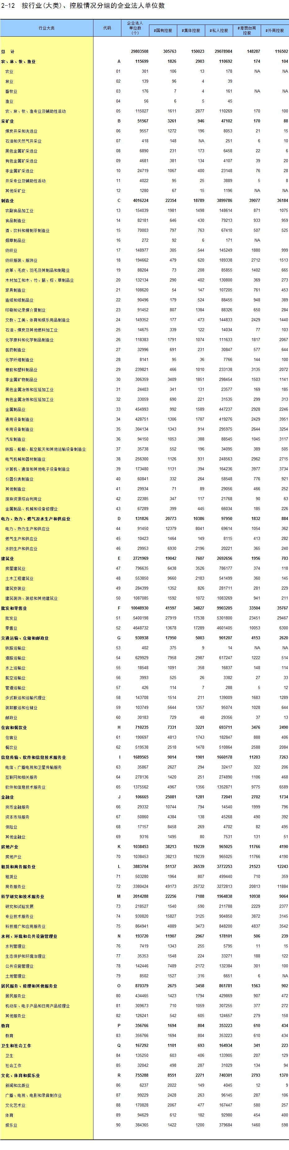 2-12 按行业(大类)、控股情况分组的企业法人单位数