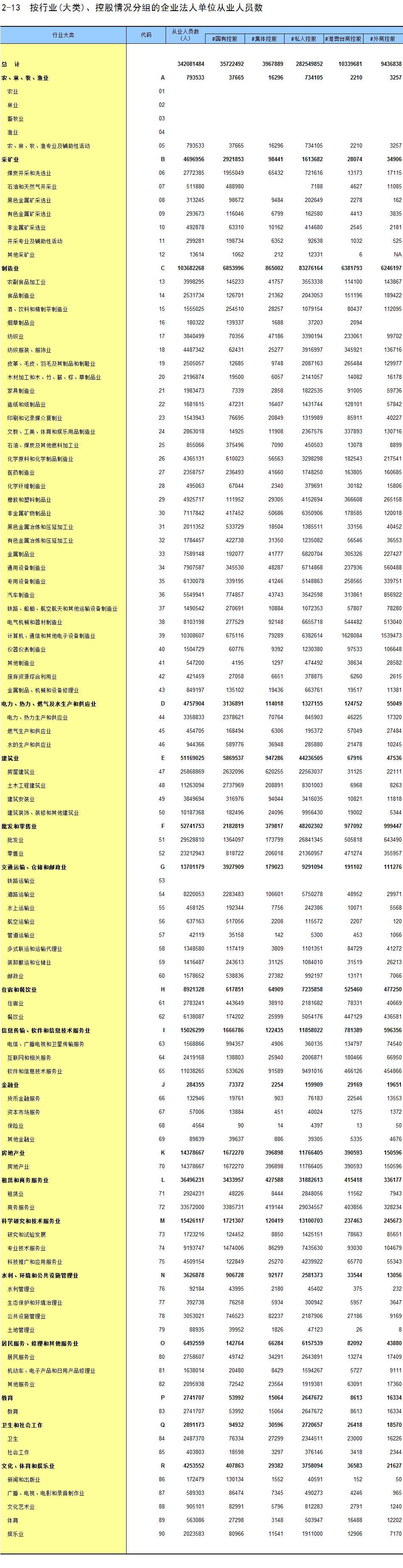 2-13 按行业(大类)、控股情况分组的企业法人单位从业人员数