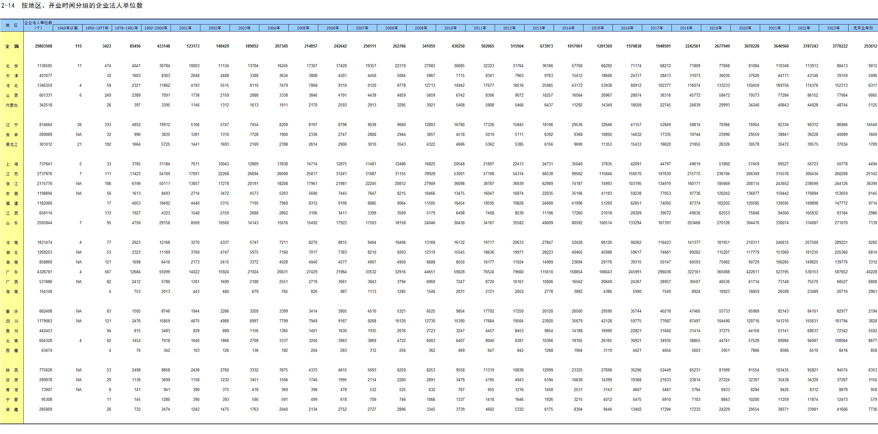 2-14 按地区、开业时间分组的企业法人单位数