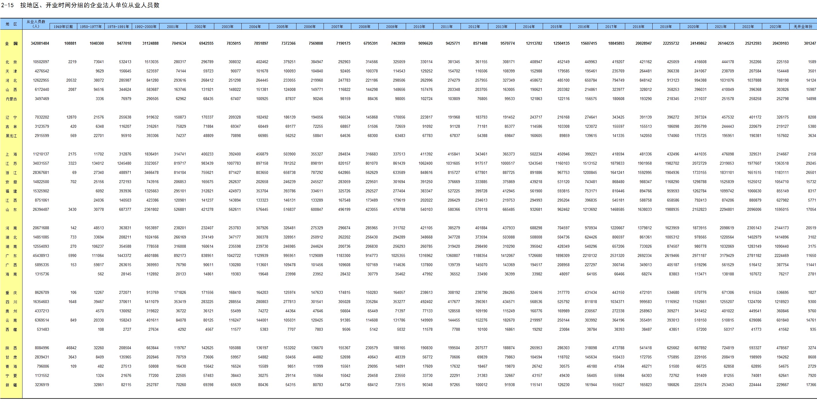 2-15 按地区、开业时间分组的企业法人单位从业人员数