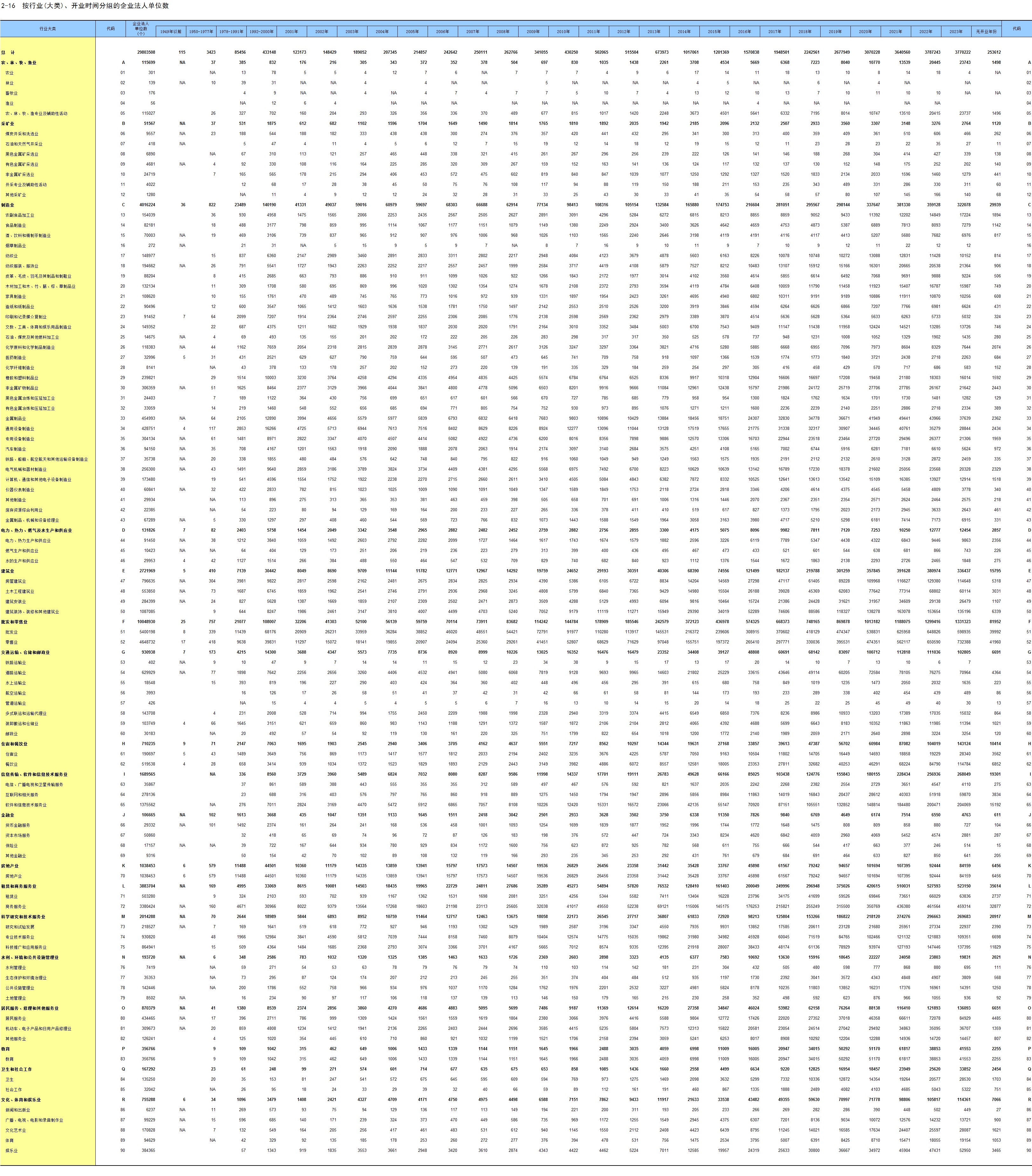 2-16 按行业(大类)、开业时间分组的企业法人单位数