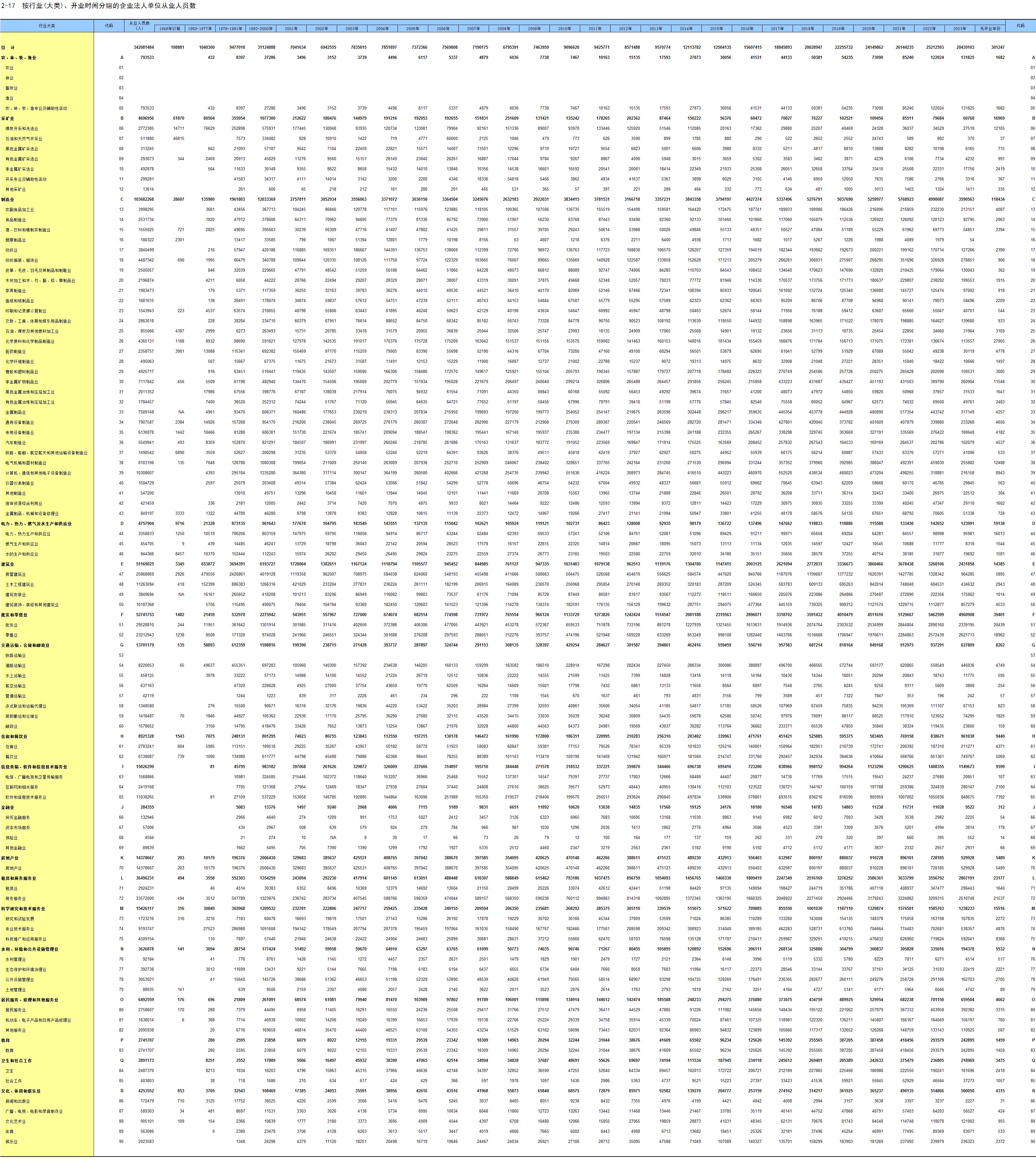 2-17 按行业(大类)、开业时间分组的企业法人单位从业人员数