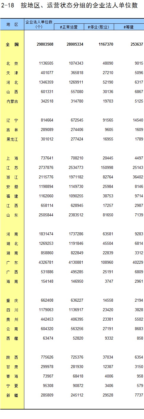 2-18 按地区、运营状态分组的企业法人单位数