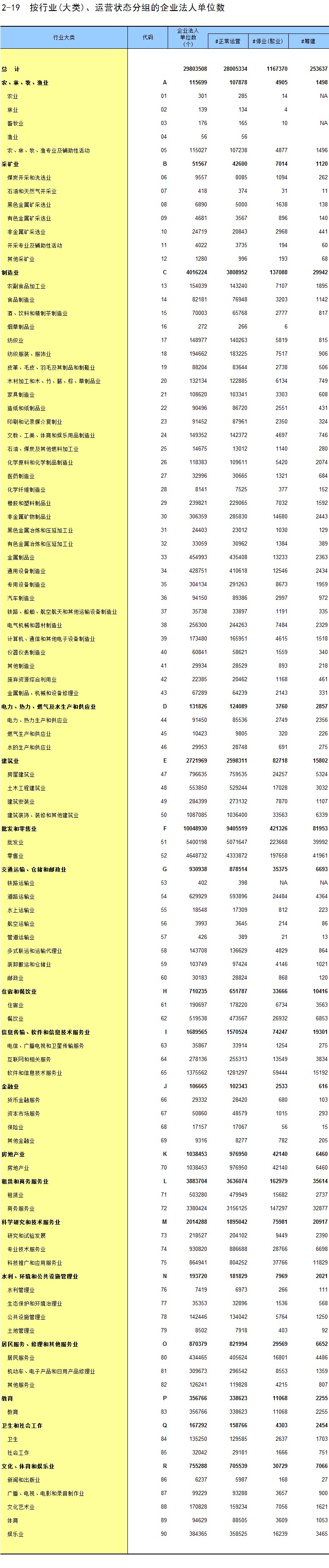 2-19 按行业(大类)、运营状态分组的企业法人单位数