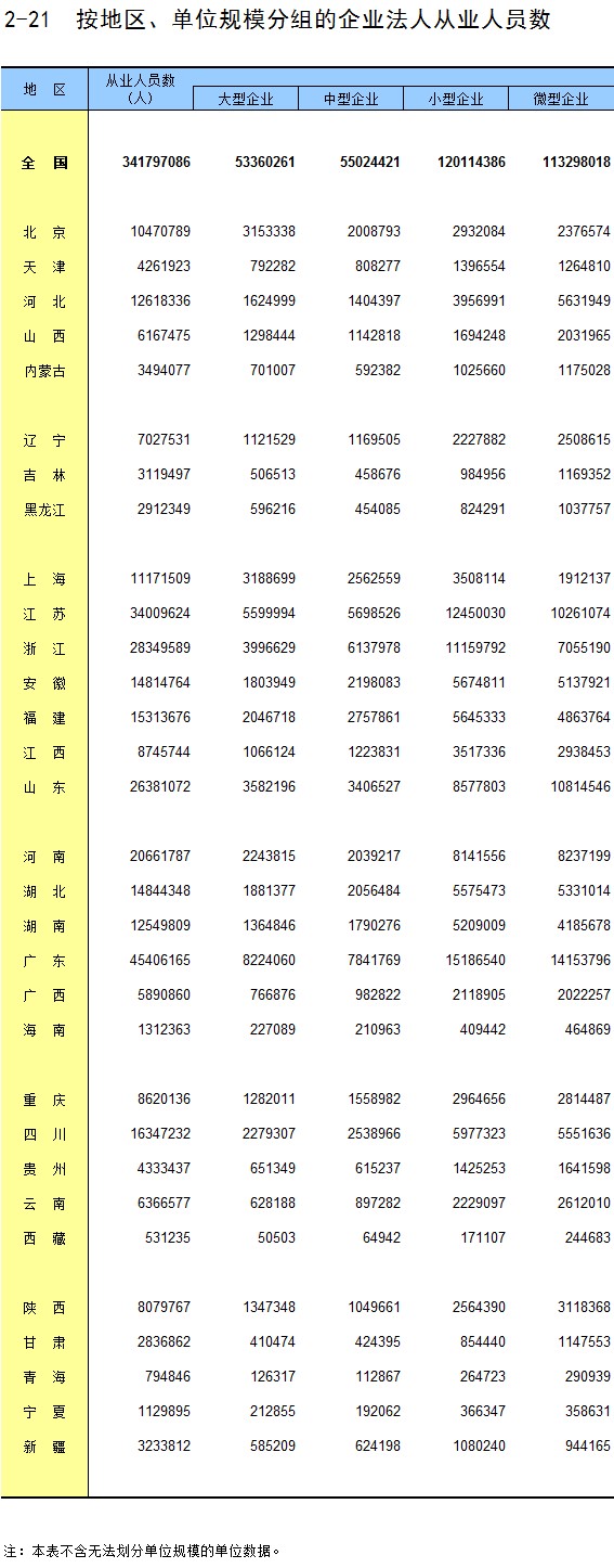 2-21 按地区、单位规模分组的企业法人从业人员数