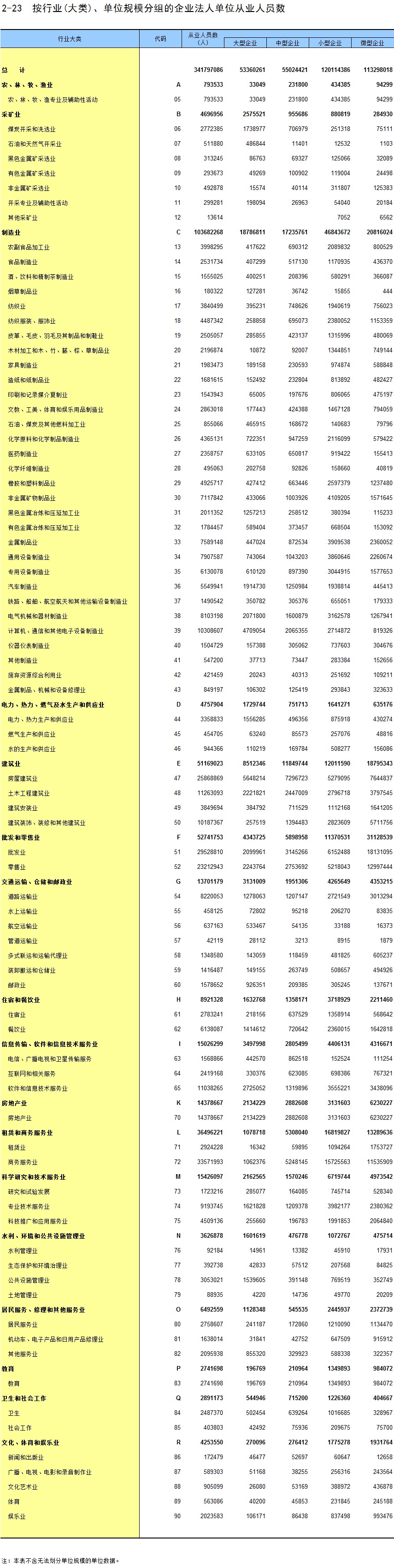 2-23 按行业(大类)、单位规模分组的企业法人单位从业人员数