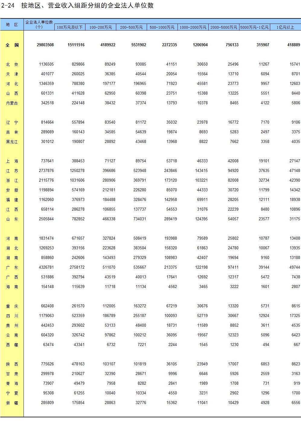 2-24 按地区、营业收入组距分组的企业法人单位数