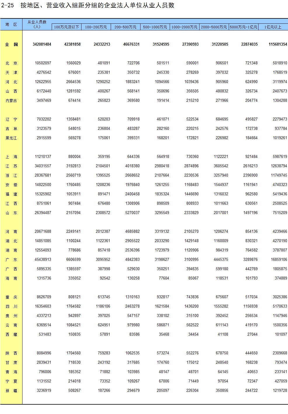 2-25 按地区、营业收入组距分组的企业法人单位从业人员数