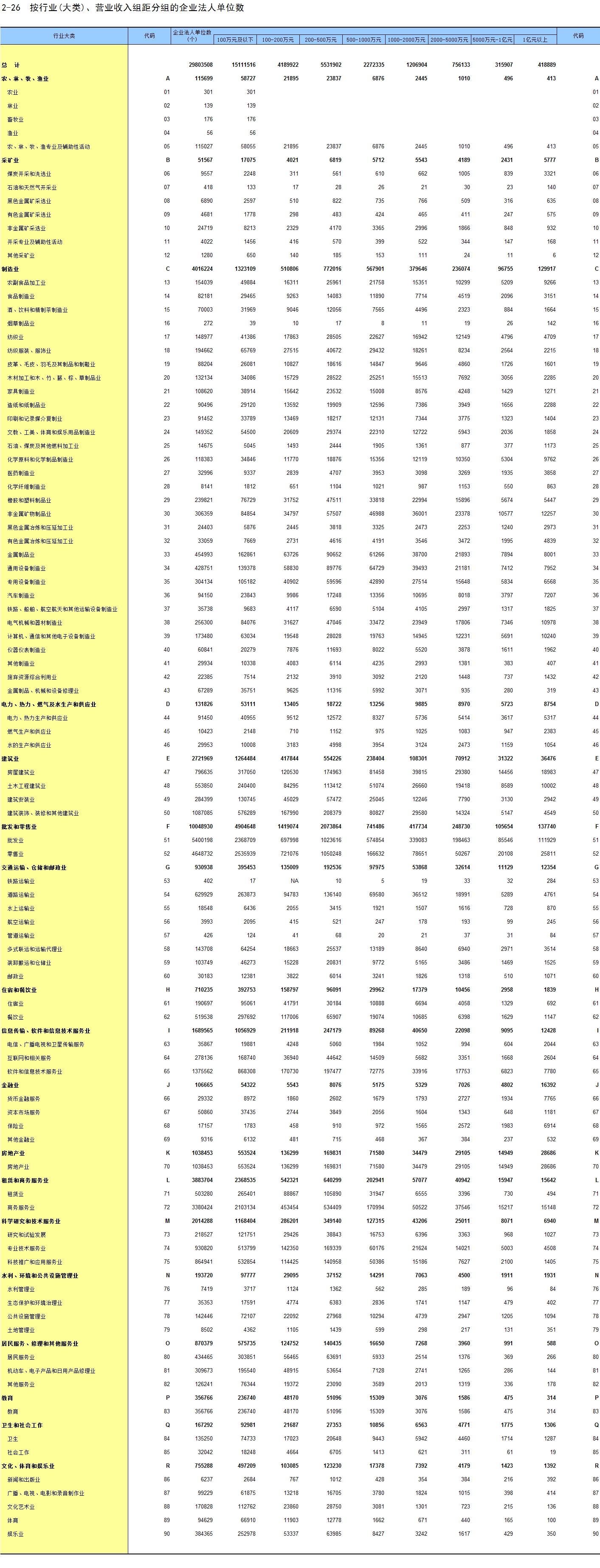 2-26 按行业(大类)、营业收入组距分组的企业法人单位数