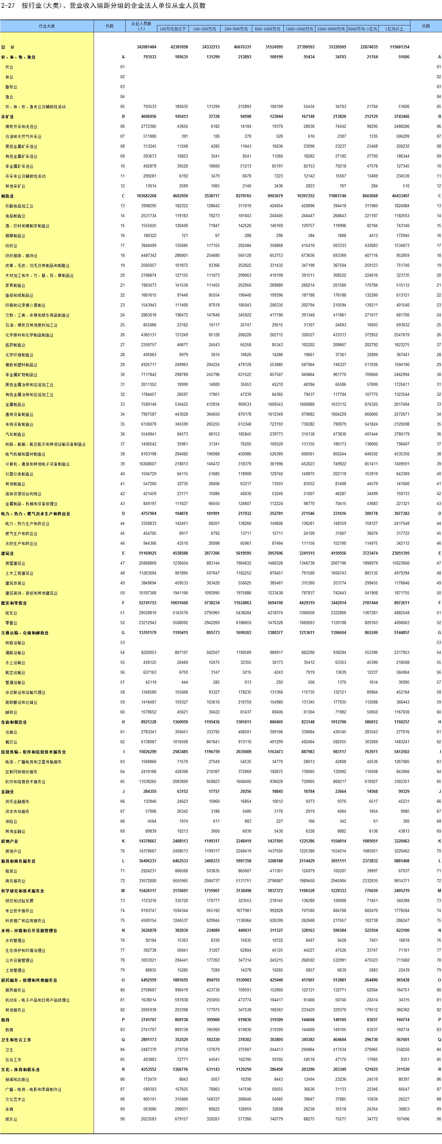 2-27 按行业(大类)、营业收入组距分组的企业法人单位从业人员数