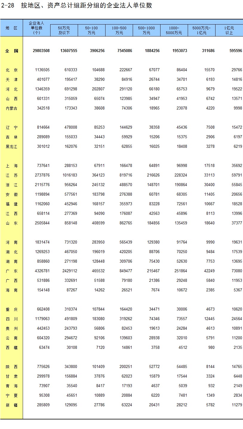 2-28 按地区、资产总计组距分组的企业法人单位数