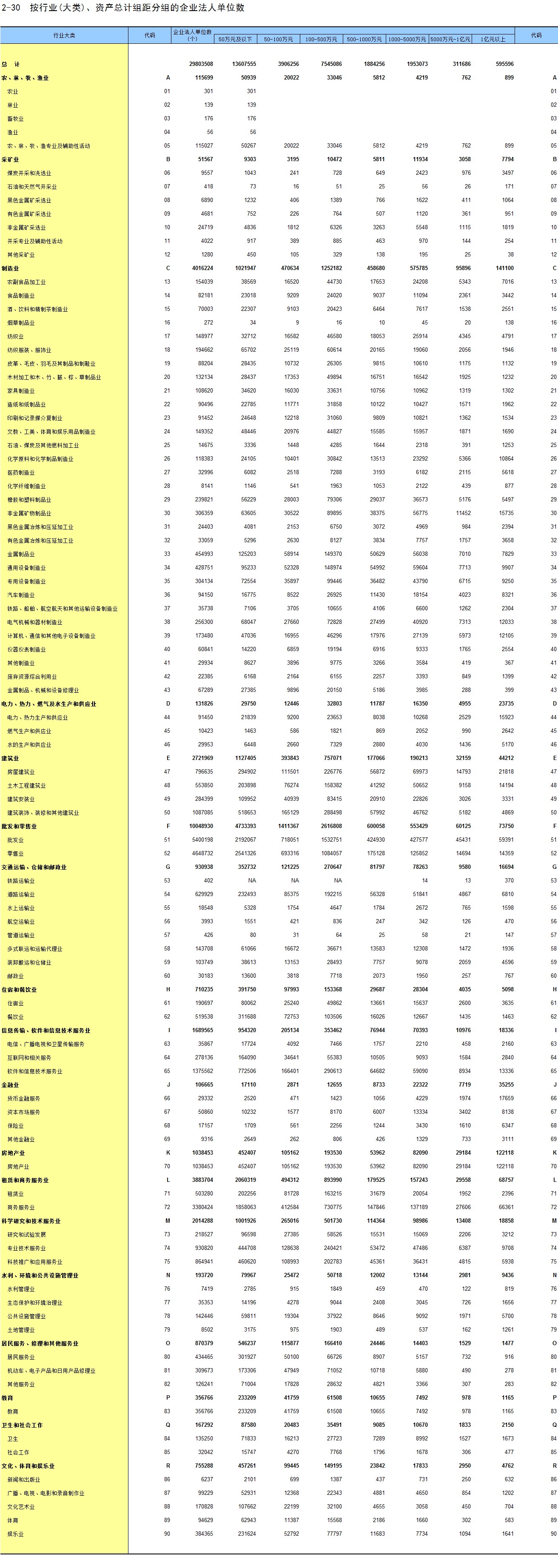 2-30 按行业(大类)、资产总计组距分组的企业法人单位数
